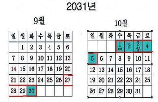 '2031년만 같아라' 달력을 보면 9월 27일부터 10월 5일까지 무려 열흘 동안 쉴 수 있다는 사실을 알 수 있다. 9월 30일부터 10월 2일까지가 추석 연휴이며, 10월 3일은 개천절이고 4일과 5일은 주말인 '황금연휴' 기간인 것. 여기에 9월 29일을 휴가로 쓴다면 그 전 주 주말인 27일부터 연휴를 보내 10일 동안 쉴 수 있는 기회다.