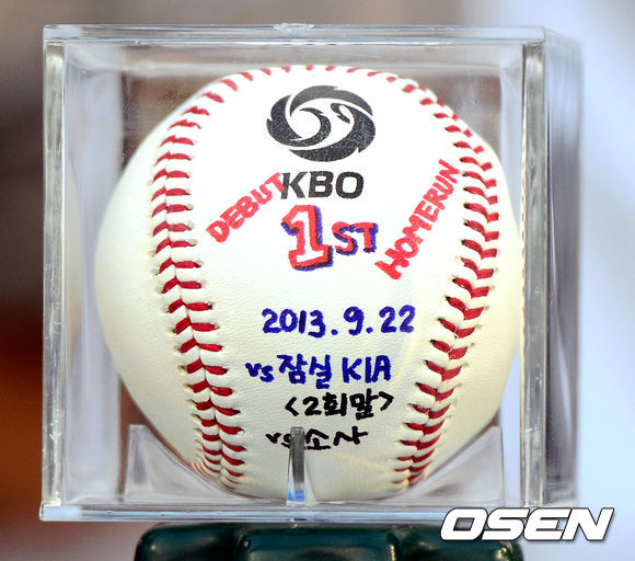 22일 오후 서울 잠실구장에서 열린 '2013 한국야쿠르트 세븐 프로야구' 두산 베어스와 KIA 타이거즈의 경기, 2회말 두산 허경민이 KIA 소사를 상대로 왼쪽 담장을 넘기는 프로 데뷔 1호 홈런을 때렸다. 두산 허경민의 프로 데뷔 1호 홈런 볼.