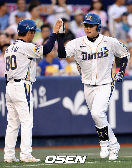 22일 오후 창원 마산야구장에서 열린 2013 한국야쿠르트 세븐프로야구 NC 다이노스와 LG 트윈스의 경기, 4회말 2사 좌월 솔로홈런을 날린 NC 권희동이 이광길 코치와 하이파이브를 하고 있다.