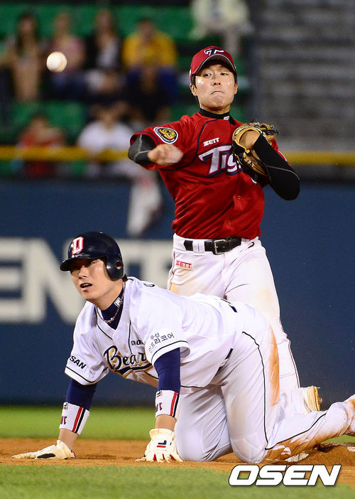 22일 오후 서울 잠실구장에서 열린 '2013 한국야쿠르트 세븐 프로야구' 두산 베어스와 KIA 타이거즈의 경기, 5회말 무사 1,2루 KIA 윤완주가 두산 허경민의 투수 앞 땅볼타구때 1루주자 두산 이원석이 2루에서 세이프되자 1루로 송구하고 있다.