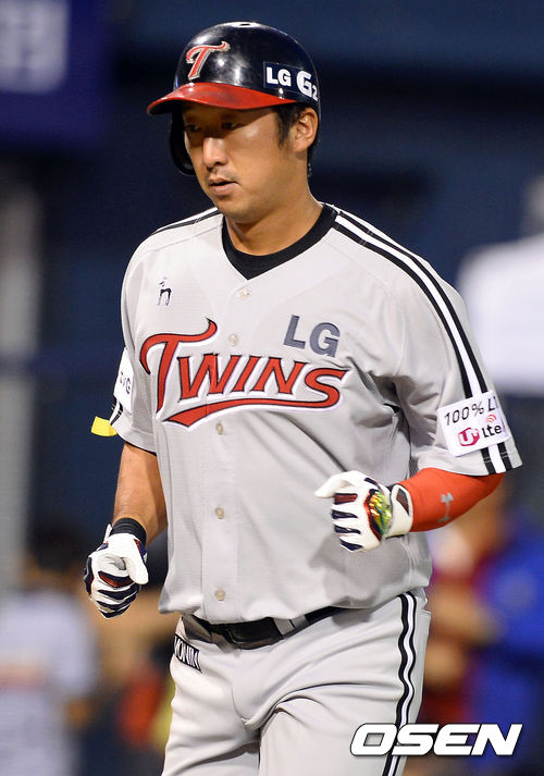 22일 오후 창원 마산야구장에서 열린 2013 한국야쿠르트 세븐프로야구 NC 다이노스와 LG 트윈스의 경기, 6회 무사 1,3루 중월 스리런 홈런을 터트린 LG이병규가 홈으로 들어오고 있다.