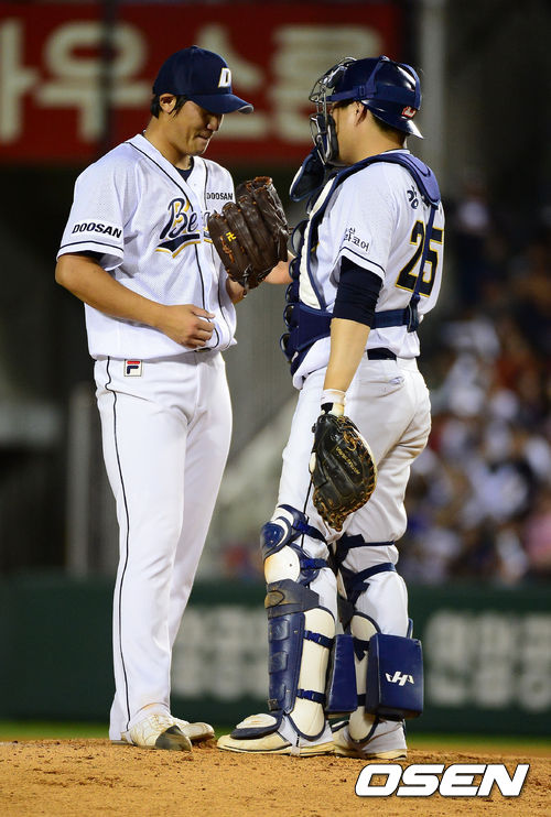 22일 오후 서울 잠실구장에서 열린 '2013 한국야쿠르트 세븐 프로야구' 두산 베어스와 KIA 타이거즈의 경기, 6회말 2사 만루 두산 양의지가 마운드에 올라 이용찬과 이야기를 나누고 있다.