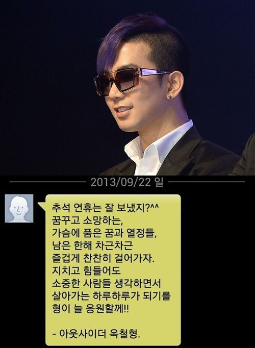 아웃사이더는 안부 문자를 통해 “추석 연휴는 잘 보냈지?"라며 "꿈꾸고 소망하는, 가슴에 품은 꿈과 열정들. 남은 한해 차근차근 즐겁게 찬찬히 걸어가자”라고 전했다.
