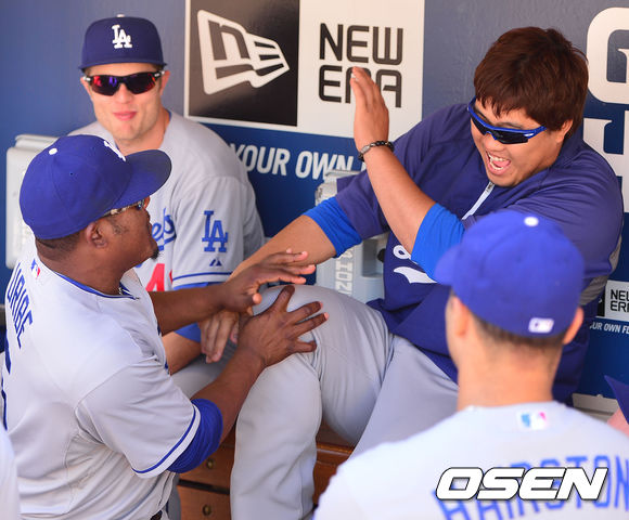 23일 (이하 한국시간) 미국 캘리포니아 샌디에이고 펫코 파크에서 열린 2013 메이저리그 샌디에이고 파드리스와 LA 다저스 경기, 경기 전 다저스 덕아웃에서 류현진과 후안 유리베가 장난을 치고 있다.