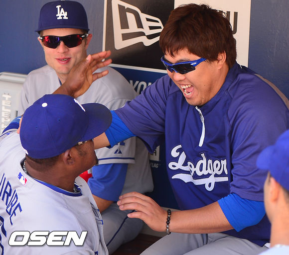 23일 (이하 한국시간) 미국 캘리포니아 샌디에이고 펫코 파크에서 열린 2013 메이저리그 샌디에이고 파드리스와 LA 다저스 경기, 경기 전 다저스 덕아웃에서 류현진과 후안 유리베가 장난을 치고 있다.