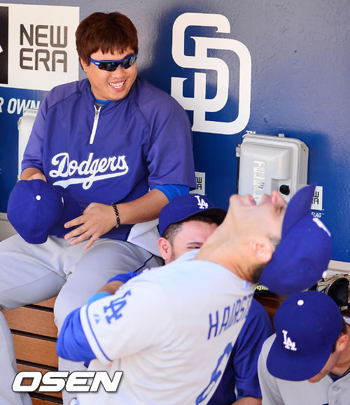23일 (이하 한국시간) 미국 캘리포니아 샌디에이고 펫코 파크에서 열린 2013 메이저리그 샌디에이고 파드리스와 LA 다저스 경기, 경기 전 다저스 덕아웃에서 류현진과 덕아웃에서 동료들과 즐겁게 얘기를 나누고 있다.