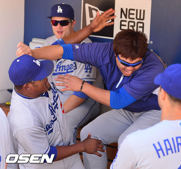 23일 (이하 한국시간) 미국 캘리포니아 샌디에이고 펫코 파크에서 열린 2013 메이저리그 샌디에이고 파드리스와 LA 다저스 경기, 경기 전 다저스 덕아웃에서 류현진과 후안 유리베가 장난을 치고 있다.