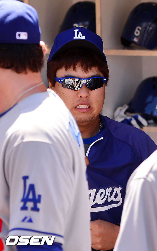23일 (이하 한국시간) 미국 캘리포니아 샌디에이고 펫코 파크에서 열린 2013 메이저리그 샌디에이고 파드리스와 LA 다저스 경기, 경기 전 다저스 덕아웃에서 류현진이 덕아웃으로 나오며 얼굴을 찡그리고 있다.