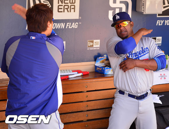 23일 (이하 한국시간) 미국 캘리포니아 샌디에이고 펫코 파크에서 열린 2013 메이저리그 샌디에이고 파드리스와 LA 다저스 경기, 경기 전 다저스 덕아웃에서 류현진이 덕아웃에서 후안 유리베와 하이파이브를 하고 있다.