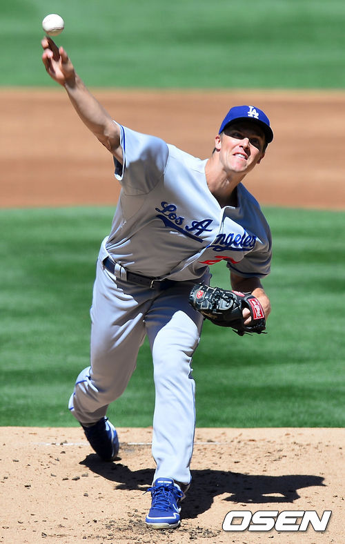 23일 (이하 한국시간) 미국 캘리포니아 샌디에이고 펫코 파크에서 열린 2013 메이저리그 샌디에이고 파드리스와 LA 다저스 경기, 다저스 선발 잭 그레인키가 힘차게 공을 뿌리고 있다.