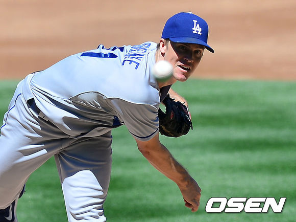 23일 (이하 한국시간) 미국 캘리포니아 샌디에이고 펫코 파크에서 열린 2013 메이저리그 샌디에이고 파드리스와 LA 다저스 경기, 다저스 선발 잭 그레인키가 힘차게 공을 뿌리고 있다.
