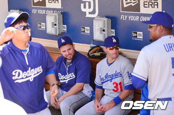 23일 (이하 한국시간) 미국 캘리포니아 샌디에이고 펫코 파크에서 열린 2013 메이저리그 샌디에이고 파드리스와 LA 다저스 경기, 덕아웃에서 놀라스코가 류현진과 유리베의 장난을 지켜보고 있다.