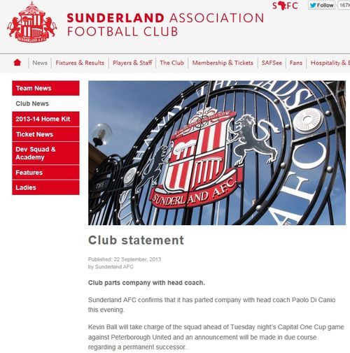 선덜랜드는 23일(한국시간) 공식 홈페이지를 통해 "우리는 디 카니오 감독을 경질하기로 결정했다. 디 카니오와 코칭스태프들에게 감사함을 전한다. 24일 피터보로 유나이티드와의 캐피탈 원 컵은 케빈 볼 코치가 감독 대행을 맡을 것"이라고 밝혔다.