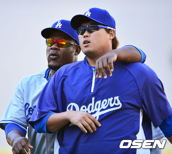 23일 (이하 한국시간) 미국 캘리포니아 샌디에이고 펫코 파크에서 열린 2013 메이저리그 샌디에이고 파드리스와 LA 다저스 경기, 경기를 마치고 후안 유리베와 류현진이 기쁨을 나누며 덕아웃으로 향하고 있다.