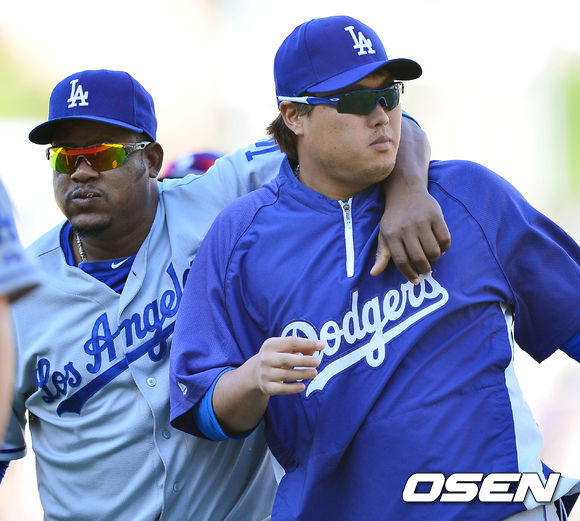 23일 (이하 한국시간) 미국 캘리포니아 샌디에이고 펫코 파크에서 열린 2013 메이저리그 샌디에이고 파드리스와 LA 다저스 경기, 경기를 마치고 후안 유리베와 류현진이 기쁨을 나누며 덕아웃으로 향하고 있다.