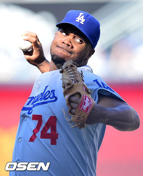 23일 (이하 한국시간) 미국 캘리포니아 샌디에이고 펫코 파크에서 열린 2013 메이저리그 샌디에이고 파드리스와 LA 다저스 경기, 다저스 켄리 잰슨이 힘차게 공을 뿌리고 있다.