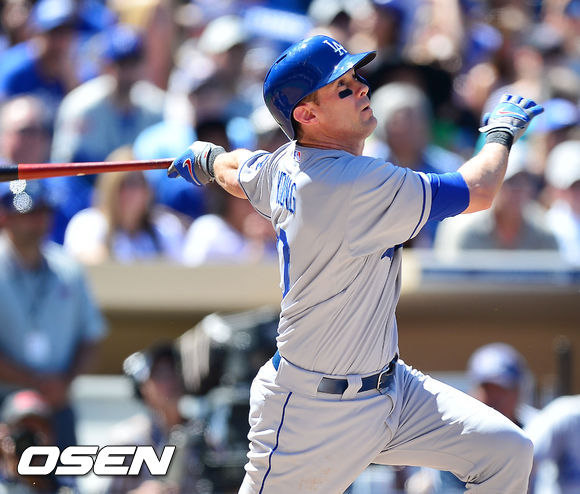 23일 (이하 한국시간) 미국 캘리포니아 샌디에이고 펫코 파크에서 열린 2013 메이저리그 샌디에이고 파드리스와 LA 다저스 경기, 2회초 1사 주자 없는 상황에서 다저스 마이클 영이 우익수 플라이 타구를 날리고 있다.