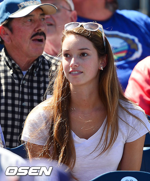23일 (이하 한국시간) 미국 캘리포니아 샌디에이고 펫코 파크에서 열린 2013 메이저리그 샌디에이고 파드리스와 LA 다저스 경기, 다저스 응원석에서 미모의 금발여성이 미소짓고 있다.