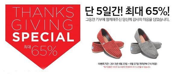 [OSEN=이슈팀] 패션브랜드 탐스 슈즈가 '추수감사절 스페셜' 이벤트를 23일~27일까지 5일간 최대 65% 할인 행사를 실시한다