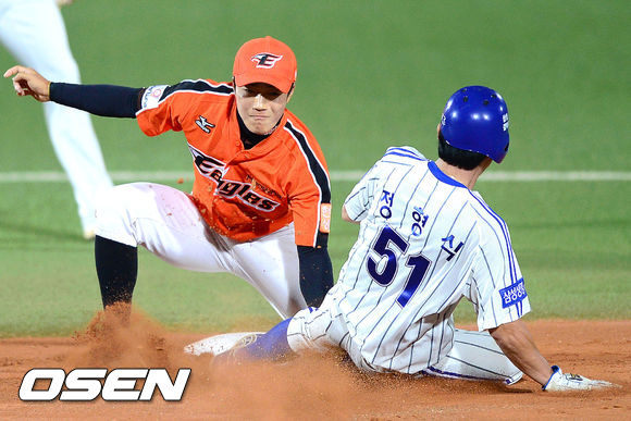 23일 오후 대구구장에서 열린 '2013 한국야쿠르트 세븐 프로야구' 삼성 라이온즈와 한화 이글스의 경기, 1회말 1사 삼성 박석민의 삼진아웃때 도루 시도한 1루 주자 정형식이 한화 조정원 2루수에게 태그아웃되고 있다.