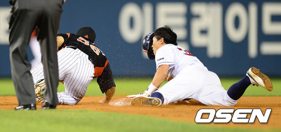 23일 오후 서울 잠실야구장에서 열린 2013 한국야쿠르트 세븐프로야구 두산 베어스와 롯데 자이언츠의 경기, 1회말 무사 1루에서 두산 임재철 타석 때 1루주자 이종욱이 도루에 성공하고 있다.