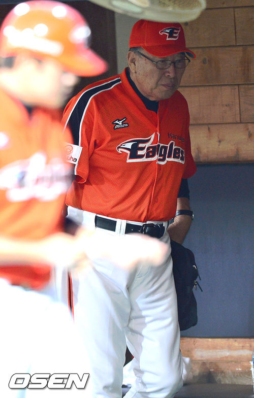 23일 오후 대구구장에서 열린 '2013 한국야쿠르트 세븐 프로야구' 삼성 라이온즈와 한화 이글스의 경기에 앞서 한화 김응룡 감독이 더그아웃으로 들어가고 있다.