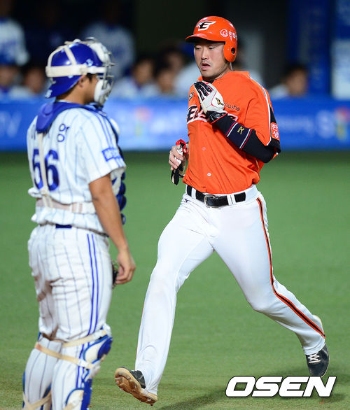 23일 오후 대구구장에서 열린 '2013 한국야쿠르트 세븐 프로야구' 삼성 라이온즈와 한화 이글스의 경기, 2회초 1사 1,2루 한화 박상규의 선취 1타점 적시타때 2루 주자 송광민이 홈을 밟고 있다
