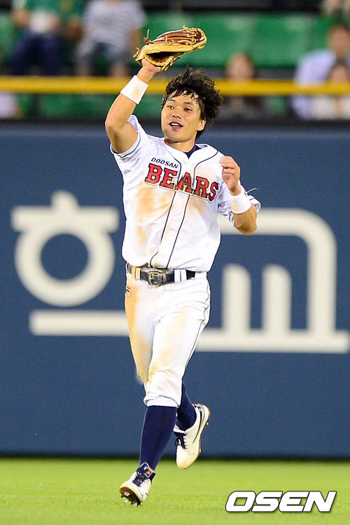 23일 오후 서울 잠실야구장에서 열린 2013 한국야쿠르트 세븐프로야구 두산 베어스와 롯데 자이언츠의 경기, 3회초 무사에서 두산 이종욱이 롯데 용덕한을 플라이로 처리하고 있다.