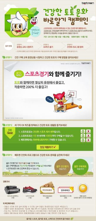 국민체육진흥공단(www.kspo.or.kr)이 발행하는 체육진흥투표권 수탁사업자인 스포츠토토의 공식온라인 발매사이트 베트맨(www.betman.co.kr)이 '건강한 토토문화 바로알기 캠페인'을 실시한다.