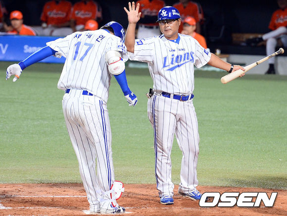 23일 오후 대구구장에서 열린 '2013 한국야쿠르트 세븐 프로야구' 삼성 라이온즈와 한화 이글스의 경기, 4회말 2사 1루한화 선발 송창현을 상대로 중월 역전 투런포를 날린 삼성 채태인이 홈을 밟고 있다.