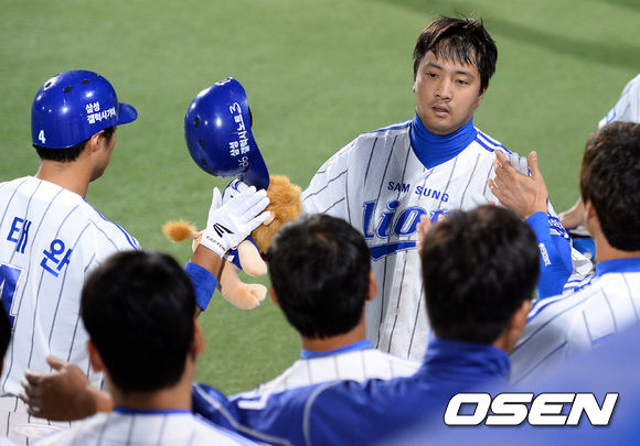 23일 오후 대구구장에서 열린 '2013 한국야쿠르트 세븐 프로야구' 삼성 라이온즈와 한화 이글스의 경기, 4회말 2사 1루한화 선발 송창현을 상대로 중월 투런포를 날린 삼성 채태인이 홈을 밟은뒤 동료들과 하이파이브를 하고 있다.