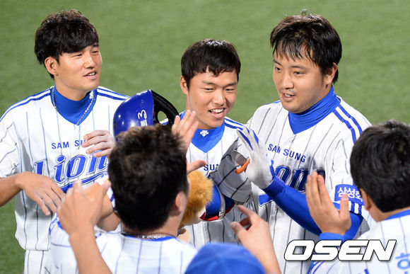 23일 오후 대구구장에서 열린 '2013 한국야쿠르트 세븐 프로야구' 삼성 라이온즈와 한화 이글스의 경기, 4회말 2사 1루한화 선발 송장현을 상대로 중월 투런포를 날린 삼성 채태인이 홈을 밟은뒤 동료들과 하이파이브를 하고 있다.