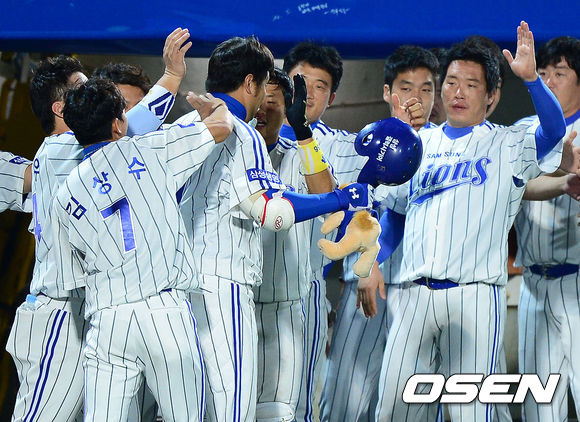 23일 오후 대구구장에서 열린 '2013 한국야쿠르트 세븐 프로야구' 삼성 라이온즈와 한화 이글스의 경기, 4회말 2사 1루 삼성 채태인이 역전 2점 홈런을 날리고 동료들의 축하를 받고 있다