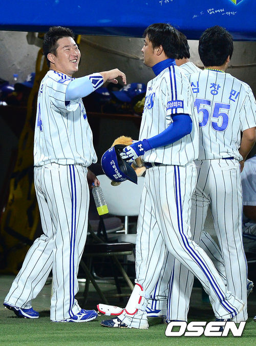 23일 오후 대구구장에서 열린 '2013 한국야쿠르트 세븐 프로야구' 삼성 라이온즈와 한화 이글스의 경기, 4회말 2사 1루 삼성 채태인이 역전 2점 홈런을 날리고 최형우의 축하를 받고 있다