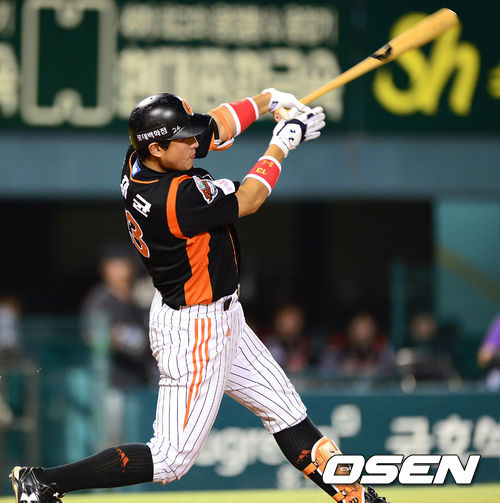 23일 오후 서울 잠실야구장에서 열린 2013 한국야쿠르트 세븐프로야구 두산 베어스와 롯데 자이언츠의 경기, 4회초 1사 1,2루에서 롯데 황재균이 좌중간을 가르는 역전 2타점 적시 3루타를 치고 있다.