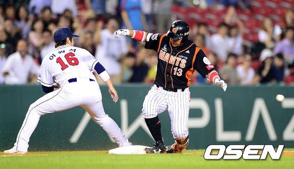23일 오후 서울 잠실야구장에서 열린 2013 한국야쿠르트 세븐프로야구 두산 베어스와 롯데 자이언츠의 경기, 4회초 1사 1,2루에서 롯데 황재균이 좌중간을 가르는 역전 2타점 적시 3루타를 치고 3루에서 세이프 되고 있다.