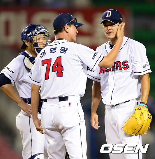 23일 오후 서울 잠실야구장에서 열린 2013 한국야쿠르트 세븐프로야구 두산 베어스와 롯데 자이언츠의 경기, 4회초 1사 1,2루에서 두산 노경은이 마운드를 내려가고 있다.
