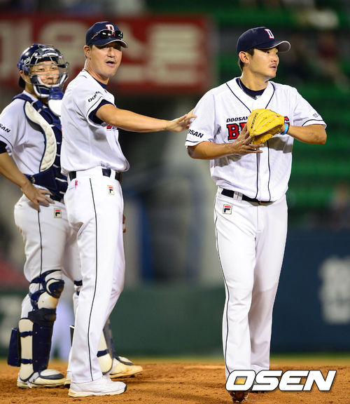 23일 오후 서울 잠실야구장에서 열린 2013 한국야쿠르트 세븐프로야구 두산 베어스와 롯데 자이언츠의 경기, 4회초 1사 1,2루에서 두산 노경은이 마운드를 내려가고 있다.