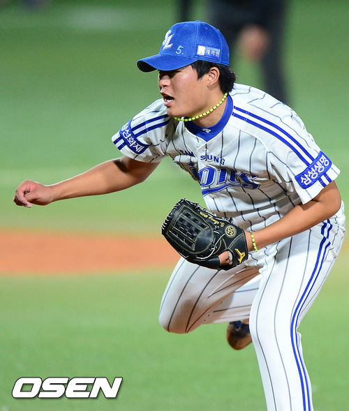 23일 오후 대구구장에서 열린 '2013 한국야쿠르트 세븐 프로야구' 삼성 라이온즈와 한화 이글스의 경기, 7회초 2사 3루 삼성 심창민 투수가 역투하고 있다.