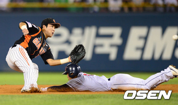 23일 오후 서울 잠실야구장에서 열린 2013 한국야쿠르트 세븐프로야구 두산 베어스와 롯데 자이언츠의 경기, 6회말 2사 1루에서 두산 최재훈 타석 때 1루주자 허경민이 도루에 성공하고 있다. 수비는 롯데 정훈.