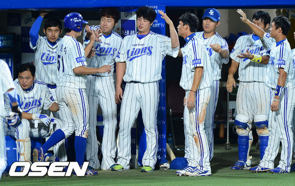 23일 오후 대구구장에서 열린 '2013 한국야쿠르트 세븐 프로야구' 삼성 라이온즈와 한화 이글스의 경기, 8회말 무사 3루 삼성 강봉규의 희생플라이때 3루 주자 정형식이 홈을 밟은 뒤 동료들의 축하를 받고 있다