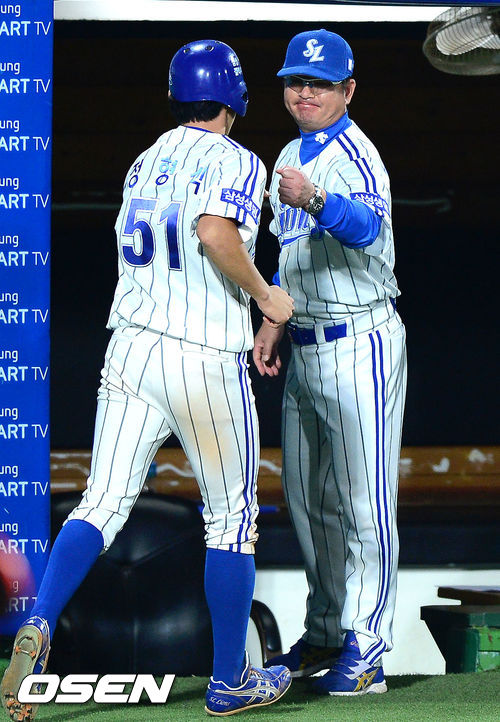 23일 오후 대구구장에서 열린 '2013 한국야쿠르트 세븐 프로야구' 삼성 라이온즈와 한화 이글스의 경기, 8회말 무사 3루 삼성 강봉규의 희생플라이때 홈을 밟은 3루 주자 정형식이 류중일 감독과 하이파이브를 하고 있다.