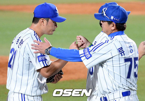경기종료 후 삼성 류중일 감독이 오승환과 하이파이브를 하고 있다. /ouxou@osen.co.kr