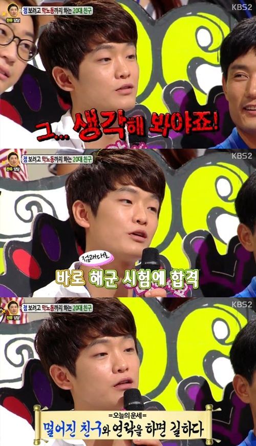점괘를 맹신하는 친구는 점쟁이가 '물을 가까이 하라'고 말하자 바로 해군에 입대했고, 4살 연하 돼지띠 처자를 만나야 좋다는 말에 기존에 사귀던 여자친구와 헤어지고 돼지띠 여자친구를 기다리고 있어 모두를 놀라게 했다.