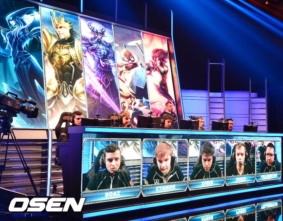 24일 (이하 한국시간) 미국 캘리포니아 컬버 시티의 컬버 스튜디오에서 열린 'LOL 시즌3 월드챔피언십(이하 롤드컵)' 8강전 북미팀 클라우드 나인(이하 C9)과 유럽팀 프나틱의 경기에서 1세트에서 승리를 거둔 프나틱 선수들이 경기를 펼치고 있다.