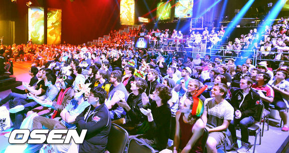 24일 (이하 한국시간) 미국 캘리포니아 컬버 시티의 컬버 스튜디오에서 'LOL 시즌3 월드챔피언십(이하 롤드컵)' 8강전 북미팀 클라우드 나인(이하 C9)과 유럽팀 프나틱의 경기가 열리는 가운데 수많은 롤 팬들이 열띤 응원을 펼치고 있다.