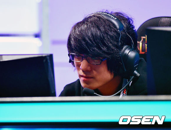 24일 (이하 한국시간) 미국 캘리포니아 컬버 시티의 컬버 스튜디오에서 열린 'LOL 시즌3 월드챔피언십(이하 롤드컵)' 8강전 한국팀 나진 블랙 소드와 유럽팀 겜빗 벤큐의 경기에서 나진 블랙 소드의 '엑스펜션' 구본택이 게임을 플레이하고 있다.
