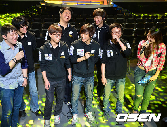 경기를 마치고 나진 소드 선수들이 환하게 웃으며 온게임넷 리포터 조은나래와 함께 인터뷰를 하고 있다. / rumi@osen.co.kr