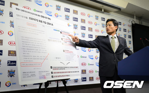 24일 오전 서울 도곡동 야구회관에서 열린 창원신축야구장 입지 타당성 재조사 결과 발표 및 간담회에서 양해영 사무총장이 결과를 발표하고 있다.