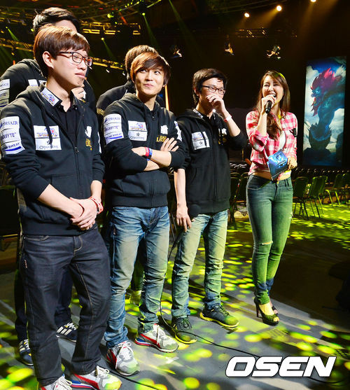 경기를 마치고 나진 소드 선수들이 환하게 웃으며 온게임넷 리포터 조은나래와 함께 인터뷰를 하고 있다. / rumi@osen.co.kr